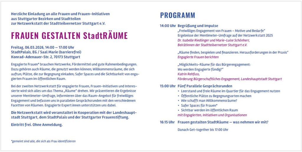Save the Date: die nächste Netzwerkstatt zum Thema “Frauen gestalten StadtRäume” findet am 06.03.2026 von 14.00-17.00 Uhr im StadtPalais statt, in Kooperation mit der Abteilung für Chancengleichheit der Landeshauptstadt Stuttgart, der Freiwilligenagentur und dem StadtPalais.
